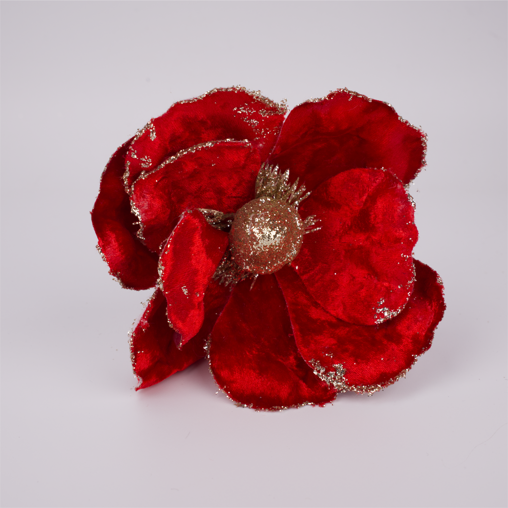 This eye-catching crimson flower has a frosting of Christmas glitter to give a your tree or mantelpiece a festive air.