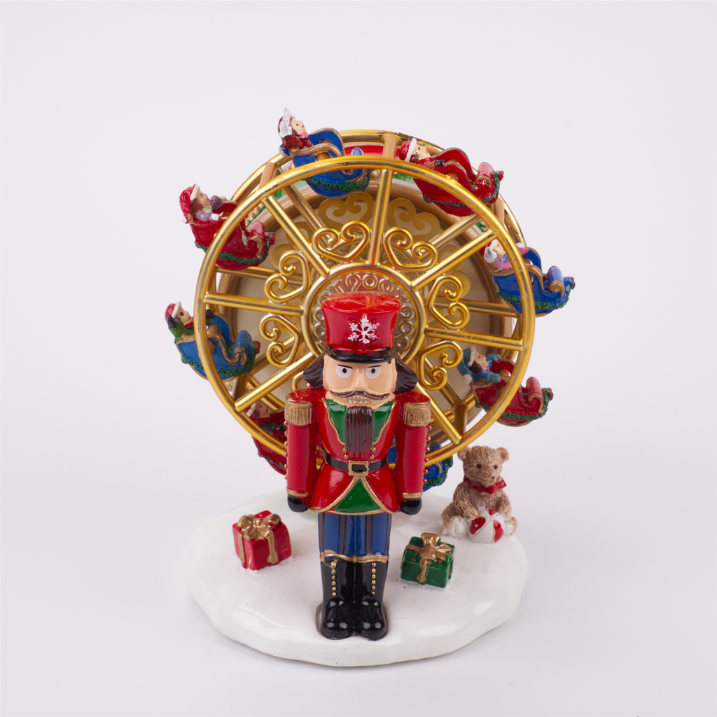 A charming festive musical automaton that plays a festive tune while the ferris wheel rotates and the gondolas turn and rock.