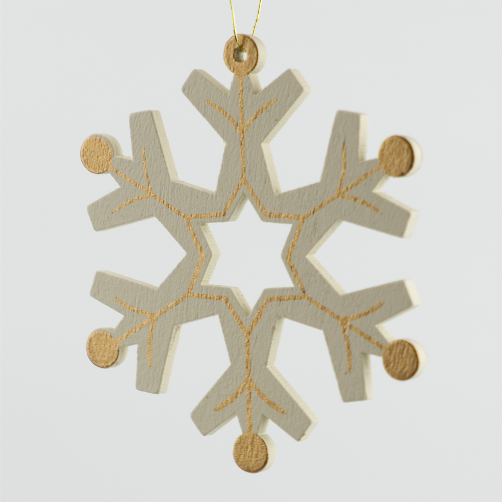 A box of twenty four elegant wooden snowflake decorations in three different designs.