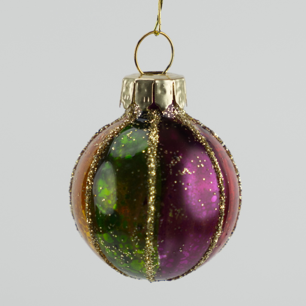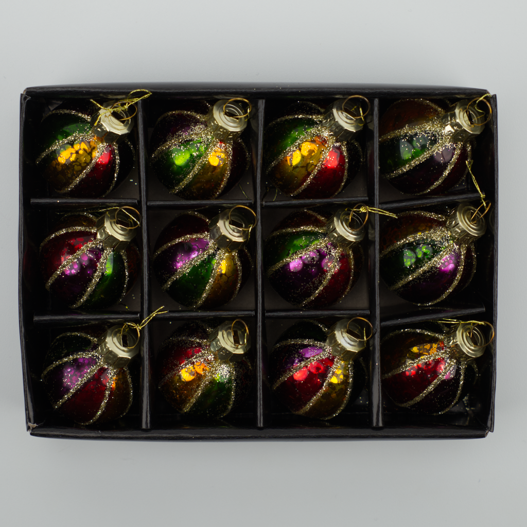 Twelve miniature glass baubles with a striking design of coloured segments separated by seasonal glittering.