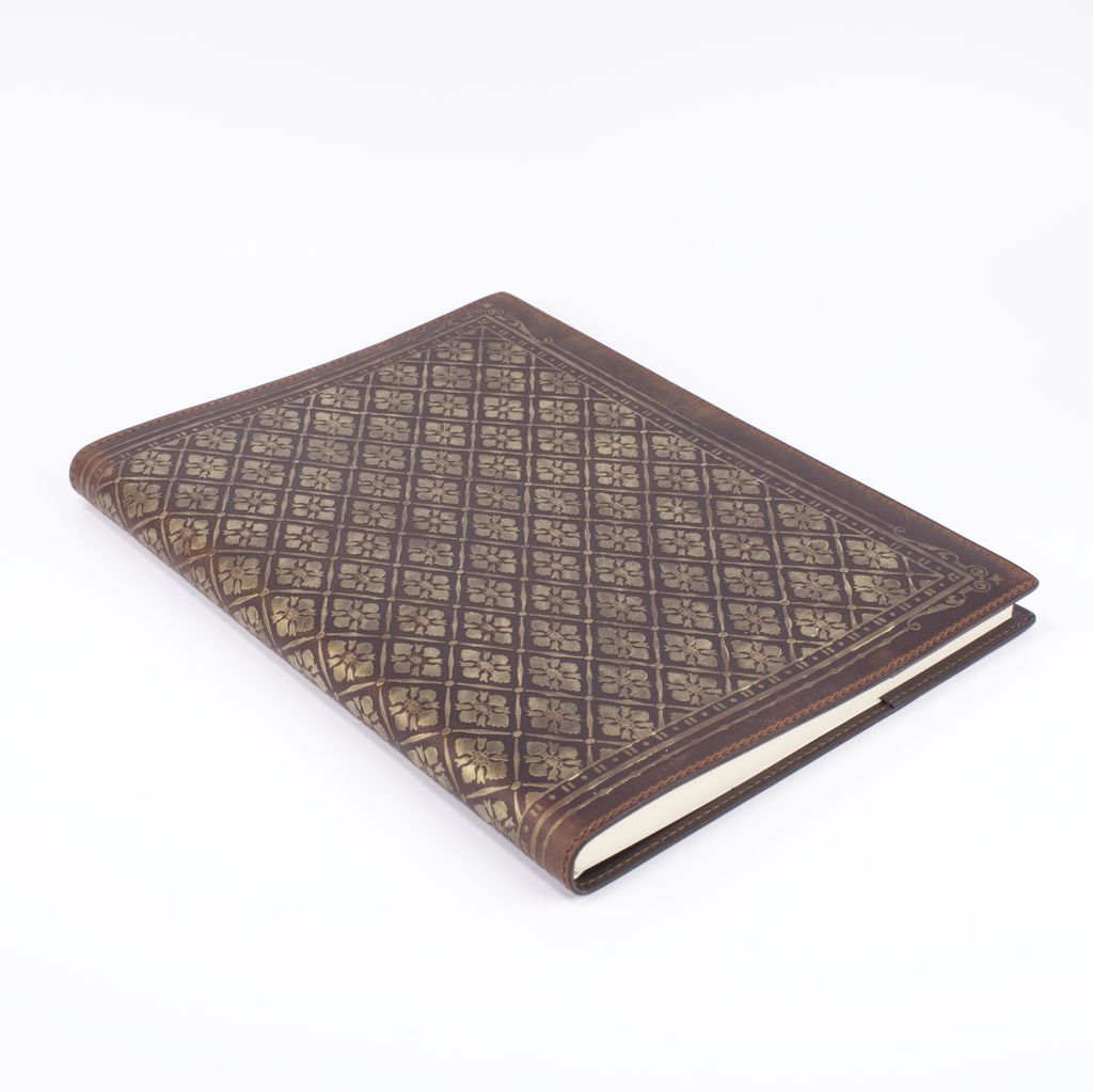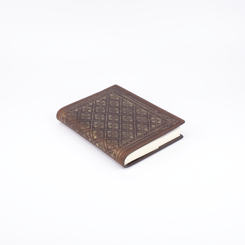 The flexible leather cover has a soft, suede-like texture, its pattern burnished with a light gold sheen to gently catch the light and the eye.